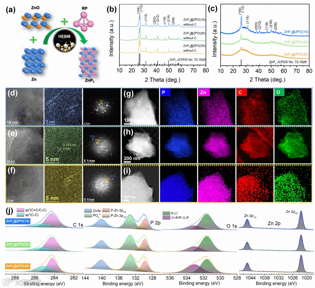 基于课题组原创性的制备金属磷化物电极材料的策略(采用金属氧化物和磷一步球磨法制备金属磷化物,原位形成的非晶态磷酸盐作为缓冲材料)。本文,优化了磷酸锌中的磷酸盐含量,通过简单地控制投料的比例,即控制ZnO,Zn和RP的比例,可控地实现不同磷酸盐掺杂的磷化锌,用以调控容量和循环稳定性之间的平衡。从而,实现在不降低循环稳定性的前提下,提高活性材料的比例,从而提高电极的容量。基于以上策略,本文制备了磷酸锌含量分别为10,20,30wt%的三个样品作为研究,如图1所示。