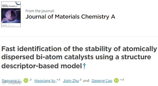 基于此,来自北京化工大学的曹达鹏教授以及许昊翔副教授,在知名期刊Journal of Materials Chemistry A上发表题为“Fast identification of the stability of atomically dispersed bi-atom catalysts using a structure descriptor-based model”的文章。