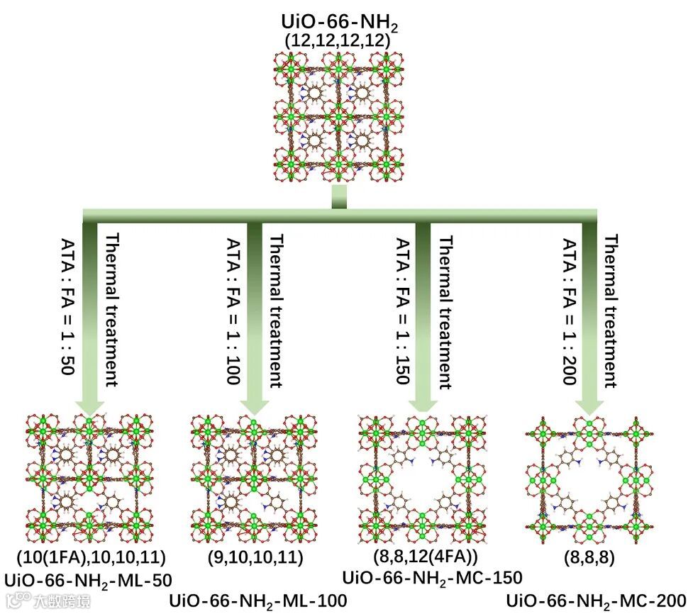 合成了一系列含不同缺陷种类(配体缺失缺陷-ML、团簇缺失缺陷-MC)和不同配体空位程度的UiO-66-NH2,命名为UiO-66-NH2-ML/MC-X [X = 50、100、150、200;X表示调节剂甲酸(FA)对应2-氨基对苯二甲酸配体(ATA)的摩尔比例],应用于无溶剂光催化还原CO2体系。