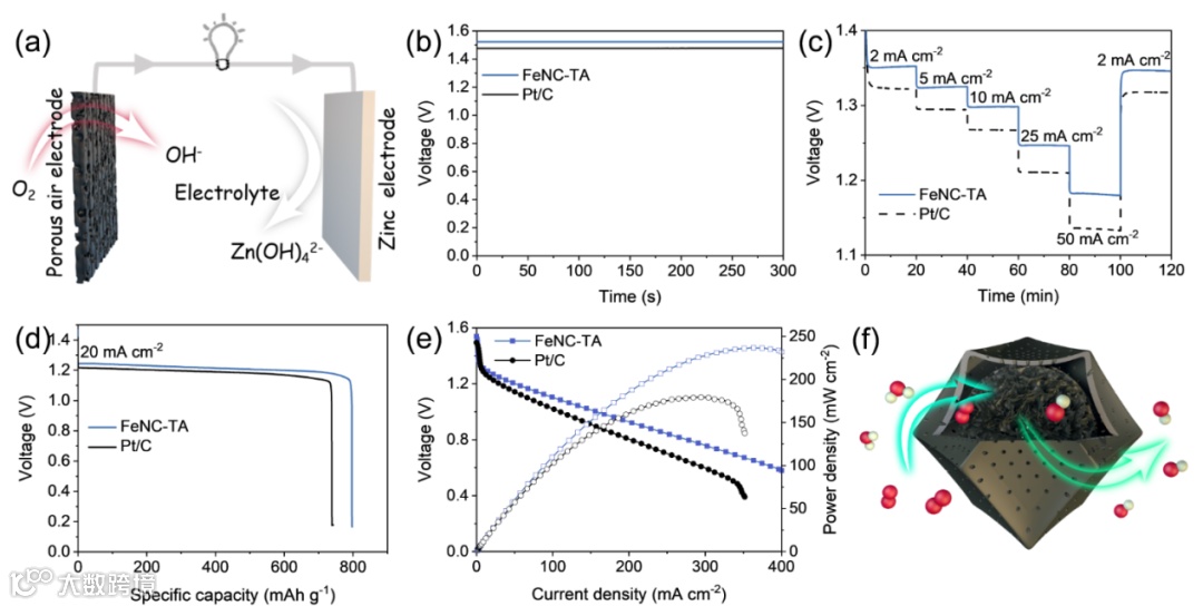 以锌片为阳极,负载FeNC-TA的碳纸为阴极,6M KOH为电解液,组装了锌空气电池。其开路电压达到1.52 V,高于以商业Pt/C作为阴极催化剂的锌空气电池。在放电极化过程中,基于FeNC-TA的锌空气电池在电流密度为 371 mA cm-2时达到最大功率密度236 mW cm-2,远远高于基于商业Pt/C的锌空气电池 (179 mW cm-2 @ 291 mA cm-2)。特别是在较大电流密度下时,FeNC-TA的优势更加显著,这是由于其独特的结构设计有利于大电流密度下反应物质的高效传输。