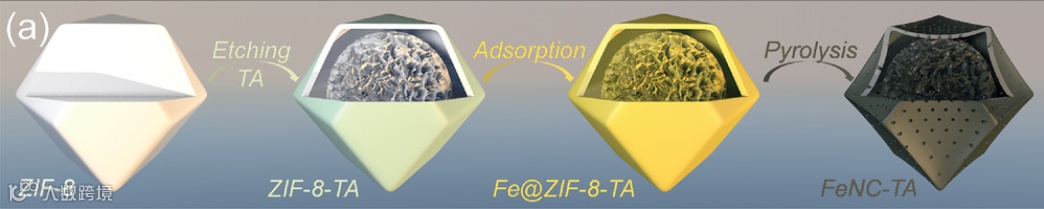 以单宁酸部分刻蚀得到的ZIF-8-TA为碳源,并利用其微孔结构通过双溶剂法吸附适量Fe离子。在900 oC下高温碳化后,Fe原子与来自于ZIF-8中的N原子配位形成了单分散的Fe-N4结构,而ZIF-8中的Zn离子则在被碳还原后被蒸发排除。