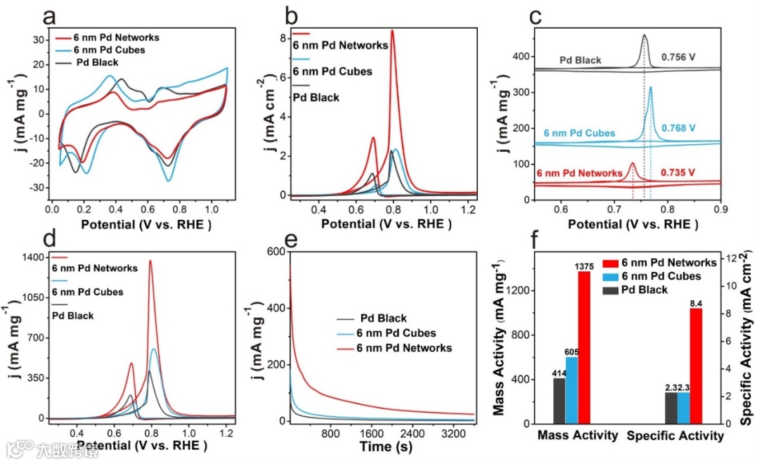 具有高密度平面缺陷的钯金属网在碱性电解质中用于甲醇氧化反应(MOR)的电催化剂,面积活性达8.4 mA cm-2,比孤立的钯纳米立方体(2.3 mA cm-2)高3.7倍。证明通过焊接形成的高密度平面缺陷钯金属纳米网有更高的催化活性。