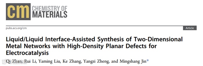 有鉴于此,西安交通大学的金明尚教授团队,在美国化学会旗下知名期刊Chemistry of Material上发表题为“Liquid/Liquid Interface-Assisted Synthesis of Two-Dimensional Metal Networks with High-Density Planar Defects for Electrocatalysis”的文章。
