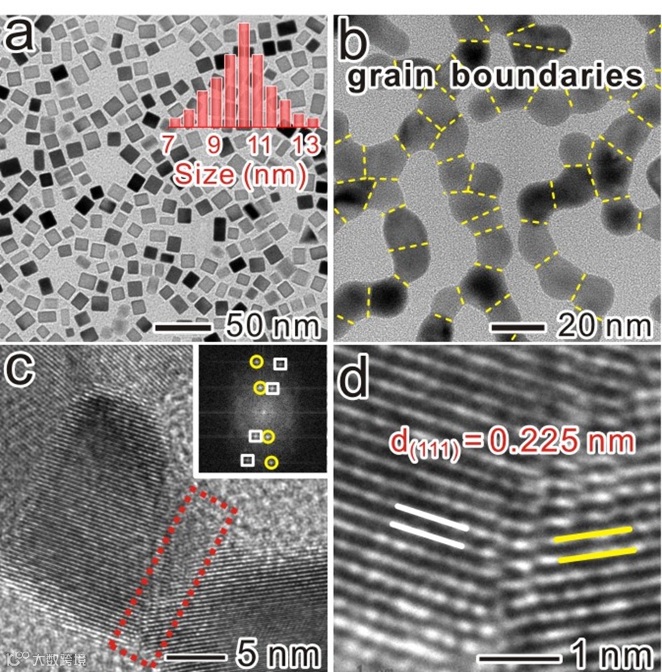 本文创新性地提出将刻蚀及再还原过程在液/液界面上进行。在界面张力下,界面处的孤立纳米晶体会逐渐收紧,不同颗粒之间的距离变短。碘化钾和N,N -二甲基甲酰胺分别用作蚀刻剂和还原剂。由原始金属纳米晶体的蚀刻产生的金属离子随即还原为原子并沉积到相邻颗粒的间隙中。