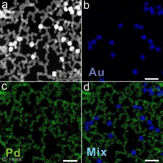 使用本工作中开发的方法可以很容易地控制金属纳米网的尺寸。即通过制备不同尺寸的金属纳米晶体并将其用作形成金属网络的原始颗粒。文中通过使用 6、18 和 25 nm 的钯纳米晶体作为起始材料,构成网络的钯纳米网的直径可以调整到大约分别为6、18和25 nm。还进一步扩展了对金和双金属钯金纳米网的合成方法,通过用Au纳米晶体完全或部分取代Pd纳米晶体,能够制备金纳米网和双金属钯金纳米网。