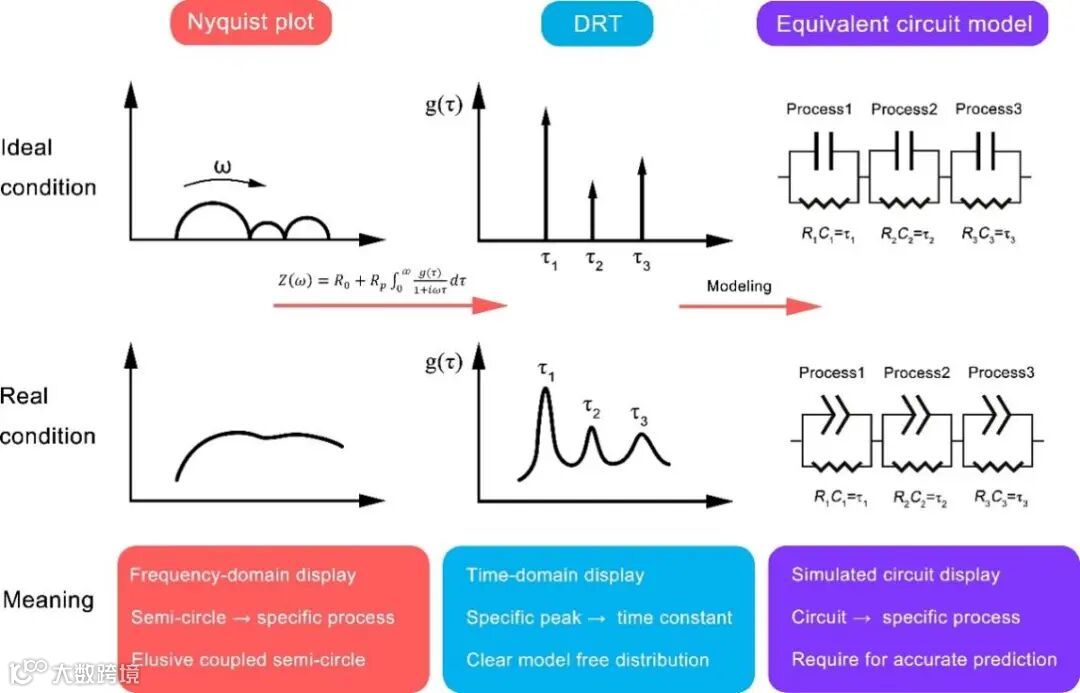 图1.EIS阻抗谱,弛豫时间分布图以及电化学拟合电路模型的关系。