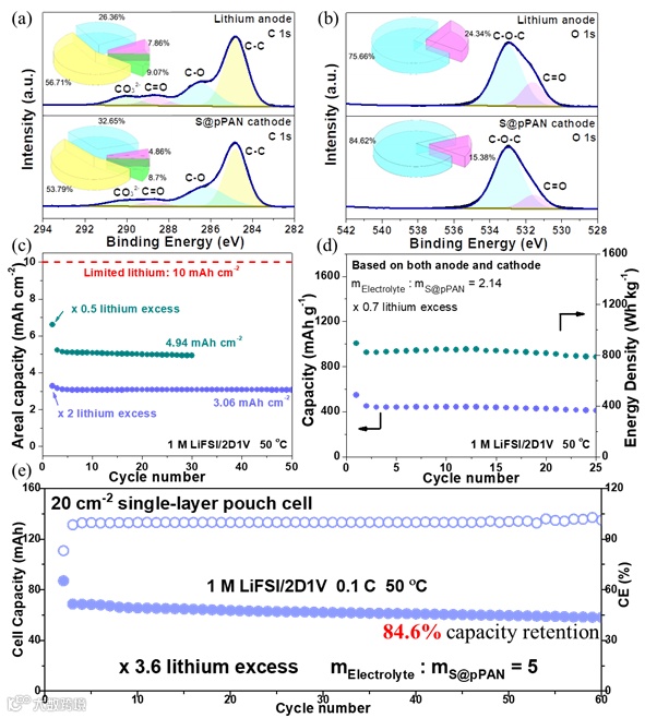 图5. 电极界面表征及实际条件下电池性能。(a-b)正负极界面XPS表征: C 1s (a), O 1s (b).(c)限锂条件下电池性能.(d)限锂贫液条件下电池性能.(e)软包锂硫电池循环稳定性。