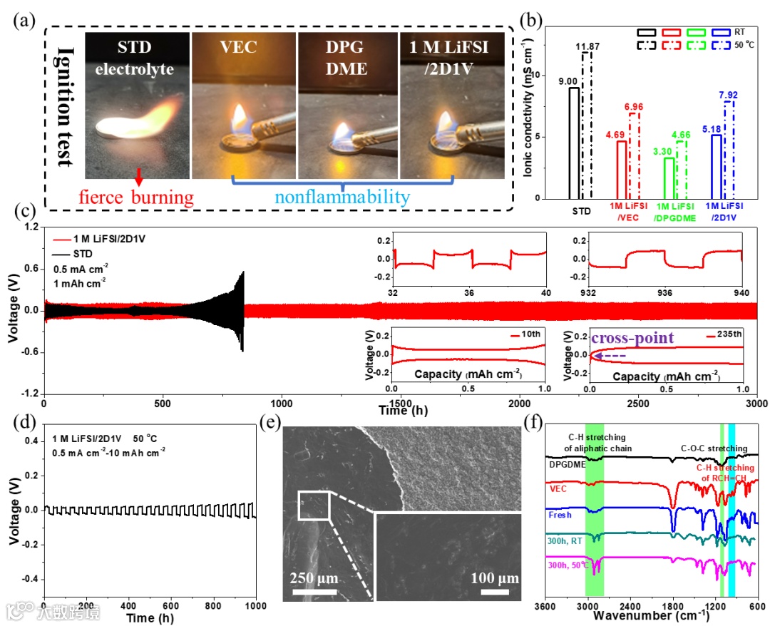 图2. 1 M LiFSI/2D1V电解液电化学性能。(a)燃烧性测试.(b)不同电解液离子电导率.(c)常温锂负极循环.(d)高温大容量锂负极循环.(e)循环后锂负极SEM.(f)循环前后FITR表征。