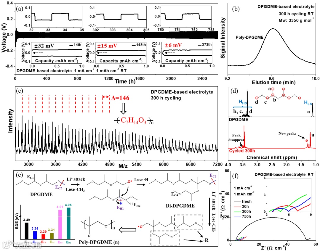 图1. DPGDME原位电化学聚合机理。(a)DPGDME基电解液锂负极循环.(b-d)聚DPGDME表征: GPC (b), MALDI mass spectra (c), 1H NMR (d).(e)DPGDME聚合机理.(f)聚合前后电化学阻抗。