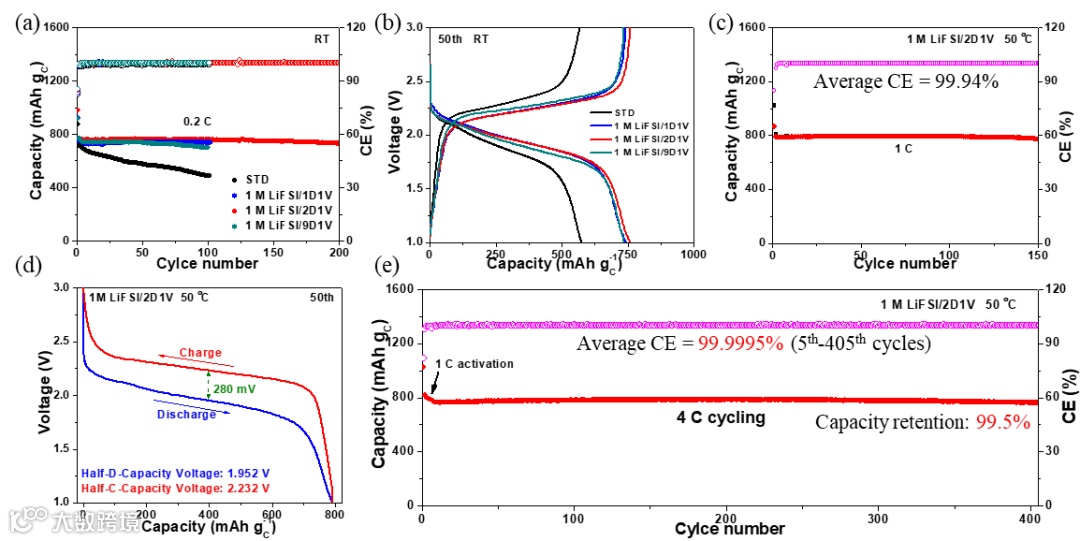 图2表征了1 M LiFSI/2D1V电解液的安全性及电化学性能,即使在高温大容量条件下仍表现出稳定循环。