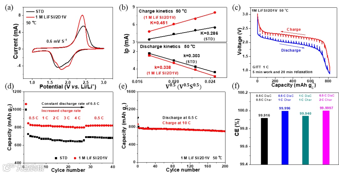 图4. 充放电动力学探究。(a)不同电解液CV曲线.(b)充放电动力学测试.(c)2D1V电解液Gitt.(d)充电倍率性能.(e)10 C快充性能.(f)不同充放电模式下库伦效率。