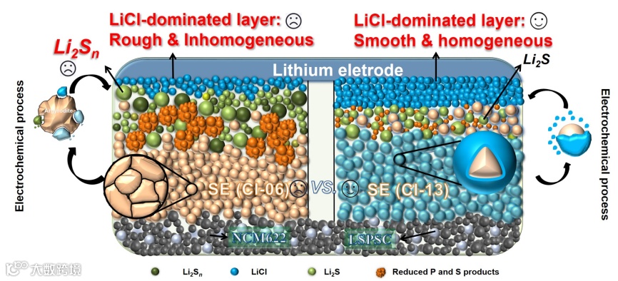 揭示了氯含量对Li-argyrodite的微观组织结构、抗锂枝晶能力、及Li|SE界面演化行为的影响,发现富氯的Li-argyrodite在热处理时会生成适当厚度的LiCl包覆层,影响电解质的抗锂枝晶能力和Li|SE界面特征,阐明了该包覆层对电化学性能的关键作用机制。