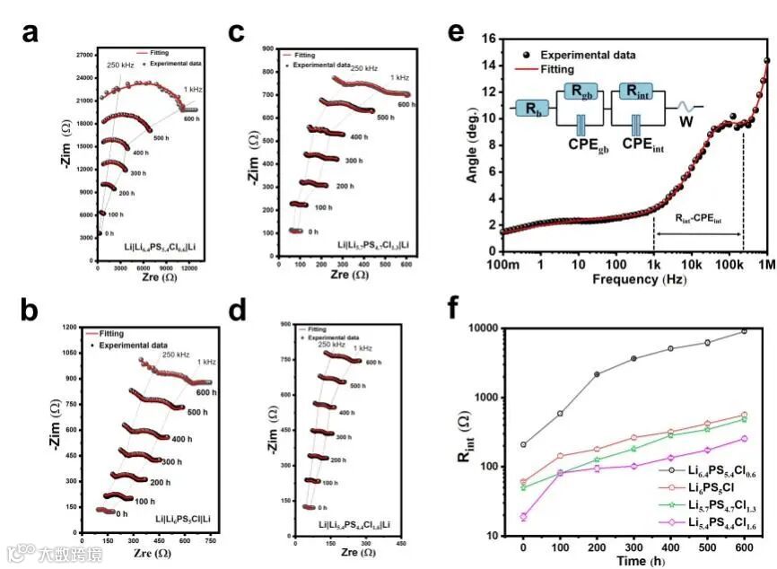 图1 (a−d) Li|SE|Li对称电池时间分辨的EIS谱,分别使用(a) Cl-06、(b) Cl-10、(c) Cl-13、(d) Cl-16电解质。(e) 选取的老化300h的Bode图及阻抗拟合所采用的等效电路。(f) Li|SE界面阻抗(Rint)随时间的变化。