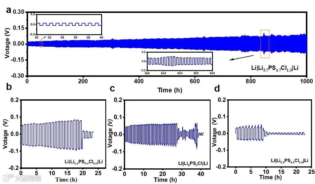 当使用更高电流密度(0.5mA/cm2)进行对称电池的长循环测试,如图3所示,Cl-13能循环超过1000圈,表现出良好的循环稳定性和缓慢增长的极化电压,而过高或过低的Cl含量,例如Cl-06、Cl10及Cl-16,循环未超过30圈就都发生短路,表明Cl-13的抑制锂枝晶能力要远优于其他组成。总结来说,中等氯含量的Li-argyrodite具有良好的对锂(电)化学界面稳定性和抑制锂枝晶能力。