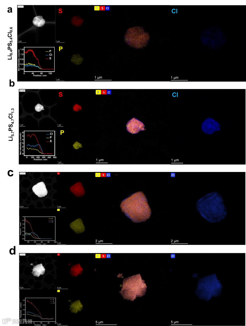 为了探究形成LiCl基界面层的机制,明白Cl在Li7-xPS6-xClx中的分布,我们通过集成EDS的Cryo-STEM研究制备的Cl-06、Cl-13和Cl-16粉末。由图5d看出,与均匀分布的P和S元素不同,Cl-16中的Cl倾向于在晶粒表面形成纳米壳层,并相互连接成连续的框架结构,只有一部分Cl掺杂于argyrodite晶格内;在Cl-13(图6b)中也观察到类似的元素分布行为,只不过它的含Cl外壳厚度比Cl-16的薄。根据STEM-EDS线扫测量Cl-16的壳厚度约为50 nm,Cl-13的壳厚度约为20 nm。