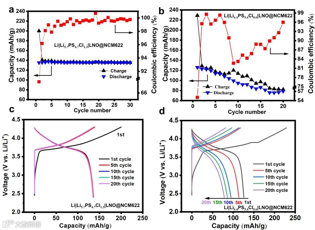 为了评估热处理的影响,在烧结后采用了两种不同的冷却工艺:1)将样品从高温缓慢冷却至400℃,然后在冰水中淬火;2)样品直接从高温中取出在冰水中淬火,分别如图6c和6d所示。直接淬火的样品没有LiCl纳米壳,表明高温区域的缓慢冷却过程是一个关键因素。由此也可推断,LiCl纳米壳是从Li7-xPS6-xClx固溶体中原位析出,否则LiCl是以团聚而不是均匀包覆层的形式存在。因此,高氯含量和适当的热处理工艺是形成LiCl包覆层的关键因素。