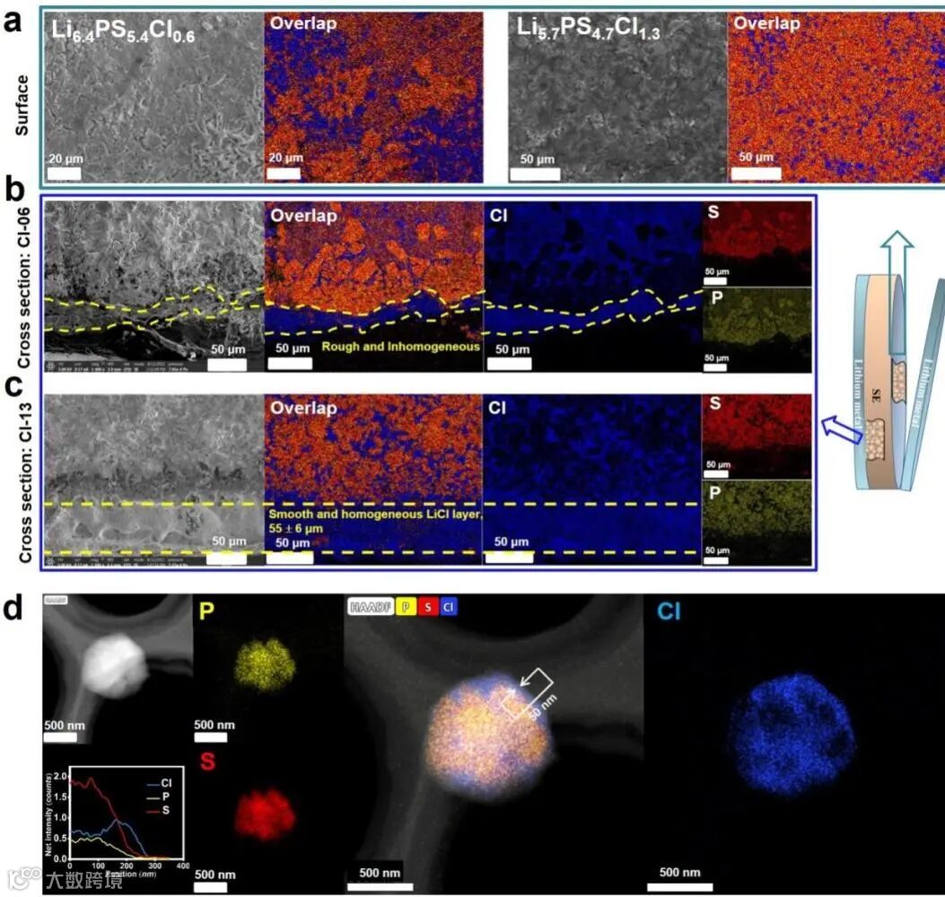 有趣的是,与锂电极交界处存在以LiCl为主相的界面层。氯含量不同的电解质该层的形貌也不同。Cl-06的LiCl界面层厚度不均匀、表面起伏;Cl-13则具有致密、厚度均匀、表面平整的LiCl界面层。含有Li超离子导体的纳米LiCl复合界面(SEI)具有快速的电荷转移动力学,且Cl-13的界面层致密均匀,有利于成为低阻SEI。因此,即使该界面层厚达55±6 μm,它仍然允许快速的离子传输。