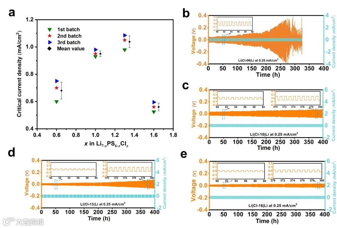 图2 Li7-xPS6-xClx (x = 0.6, 1.0, 1.3, 1.6)电解质的抑制锂枝晶能力和对Li的电化学循环稳定性。(a) 不同批次Li-argyrodite的临界电流密度(CCD)。(b−e) 在0.25 mA/cm2下使用Cl-06 (b), Cl-10 (c), Cl-13 (d), 以及Cl-16 (e)电解质的Li||Li对称电池的镀锂/剥锂长循环稳定性。