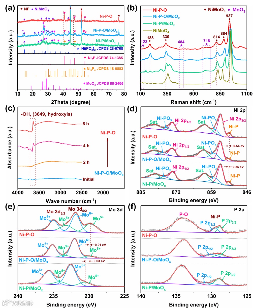 图2. (a) Ni-P-O、Ni-P-O/MoOx和Ni-P/MoOx的XRD图。(b) NiMoO4、Ni-P-O、Ni-P-O/MoOx和Ni-P/MoOx的拉曼光谱图。(c) 0-6 h 不同反应时间间隔下Ni-P-O/MoOx的傅里叶红外图。(d-f) Ni-P-O、Ni-P-O/MoOx和Ni-P/MoOx的高分辨Ni 2p、Mo 3d 和P 2p图。