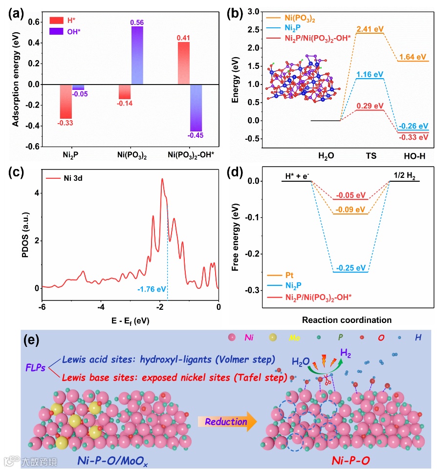 图4. (a) Ni2P,纯Ni(PO3)2和Ni(PO3)2-OH*的OH*结合能 (ΔEOH) 和H*结合能(ΔEH)。(b) Ni(PO3)2, Ni2P和Ni2P/Ni(PO3)2-OH*的水解离能垒。插图: Ni2P/Ni(PO3)2-OH*的模型。(c) 计算得到的Ni2P和Ni2P/Ni(PO3)2-OH*的Ni 3d能带。Ni的d带中心在曲线中突出显示)。(d) Pt, Ni2P和Ni2P/Ni(PO3)2-OH*的H*吸附自由能。(e)在碱性HER过程中,Ni-P-O/MoOx重构生成Ni-P-O和受阻路易斯酸碱对增强催化活性的机理。