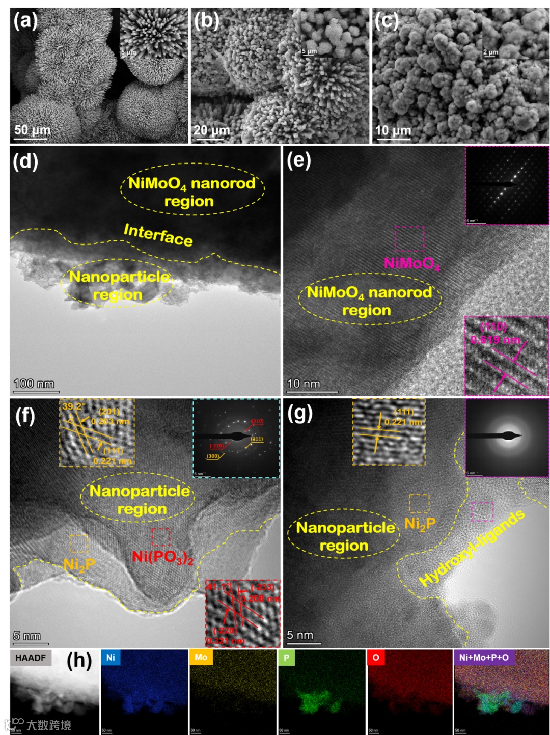 图1. (a-c) NiMoO4前驱体、Ni-P-O/MoOx、Ni-P-O的SEM图片;(d-g) Ni-P-O/MoOx的TEM图片;(h) 元素分布图。