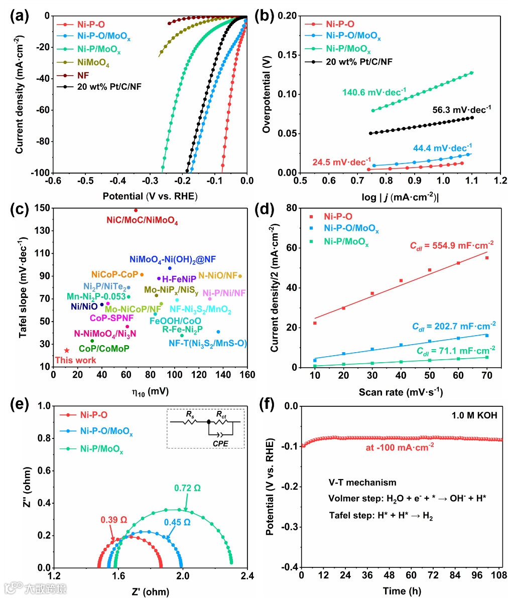 图 3. 不同催化剂的 (a) 线性扫描曲线,扫速2 mV·cm-2,1.0 M KOH;(b) 塔菲尔斜率。(c) Ni-P-O催化剂的HER活性与近期报道的高效催化剂的性能对比。(d) 非法拉第区间双电层电容的线性关系评估ECSA。(e) 不同催化剂的交流阻抗图。(f) Ni-P-O在100 mA·cm-2条件下的计时电流图