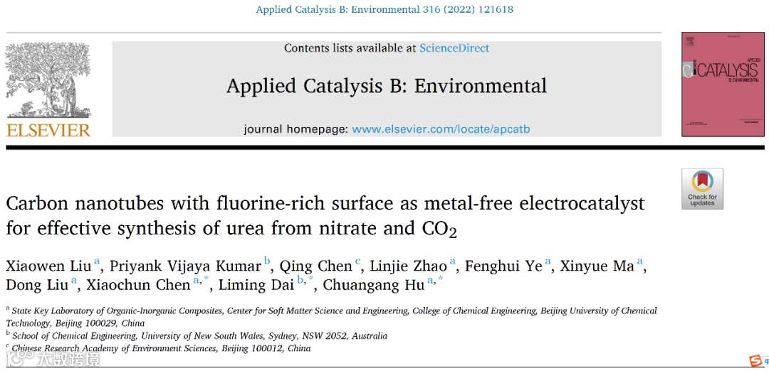 本文中,北京化工大学胡传刚教授、陈晓春教授和澳大利亚新南威尔士大学戴黎明教授在Applied Catalysis B: Environmental上发表了题为“Carbon nanotubes with fluorine-rich surface as metal-free electrocatalyst for effective synthesis of urea from nitrate and CO2”的研究论文(DOI: 10.1016/j.apcatb.2022.121618)。
