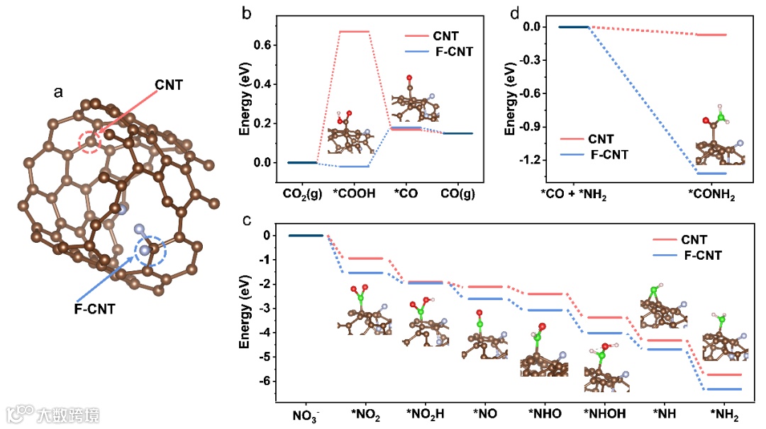 DFT计算表明F 掺杂碳纳米管催化剂有利于促进CO*和NH2*中间体的吸附、耦合,从而降低进一步合成尿素的能垒。