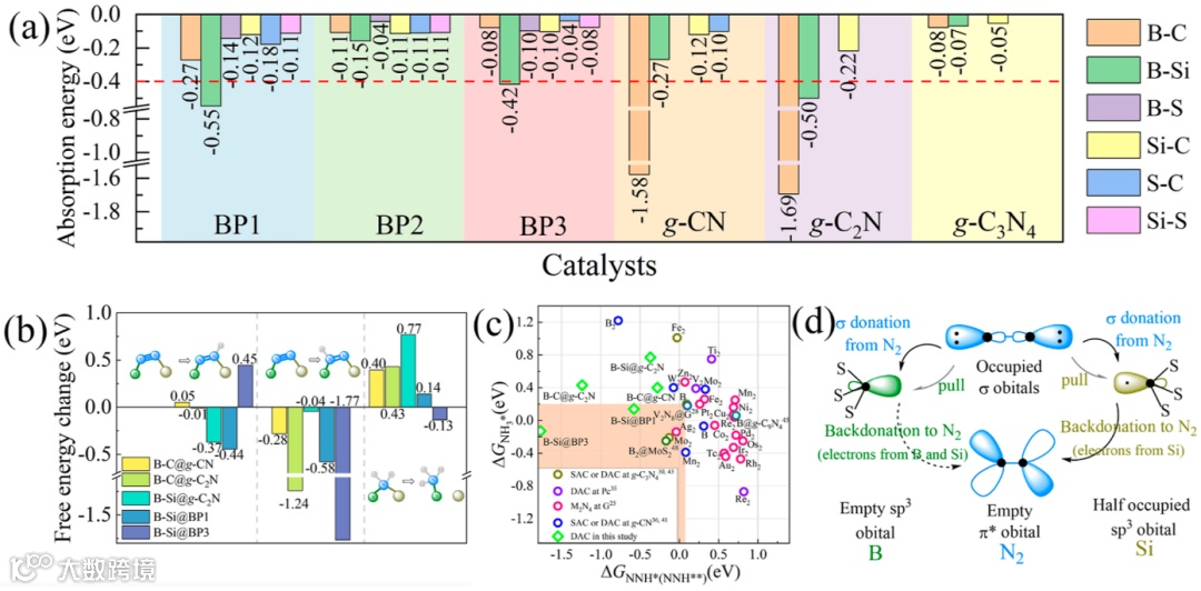 图 2. (a) 不同催化剂的吸附能。(b) 不同催化剂的第一步和最后一步加氢过程中的自由能变化。(c) NRR 在不同催化剂上加氢的第一步和最后一步的自由能变化。(d)B-Si@BP 的“捕获-回馈-再捕获”机理图。