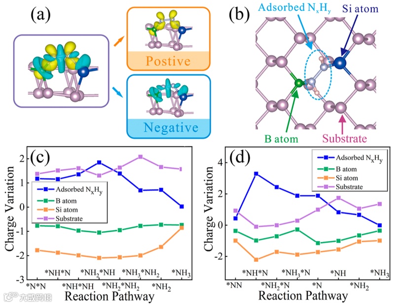 图 5. (a) B-Si@BP1 吸附 N2 后的电荷密度差异,其中黄色和青色分别表示正电荷和负电荷。(b) 反应表面不同物种的示意图。(c,d) B-Si@BP1 和 B-Si@BP3 上 NRR 的电子电荷变化,其中正值表示获得的电子,负值表示失去的电子。