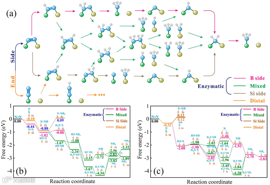 图 3. (a) 在B-Si@BP 上将 N2 还原为 NH3 的可能路径示意图。(b,c) 在B-Si@BP1 和 B-Si@BP3 上的 N2还原反应的自由能图。