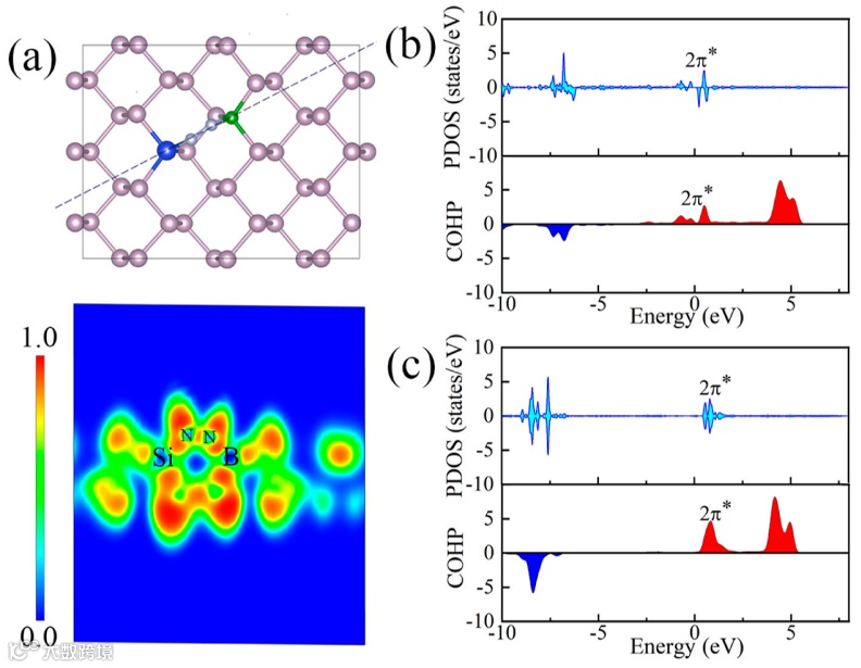图 6. (a) N2 在 B–Si@BP1 上的电子分布函数图。(b,c) 分别在 B-Si@BP1 和 B-Si@BP3 上吸附 N2 的部分态密度和晶体轨道哈密顿布居。费米能级设置为零。