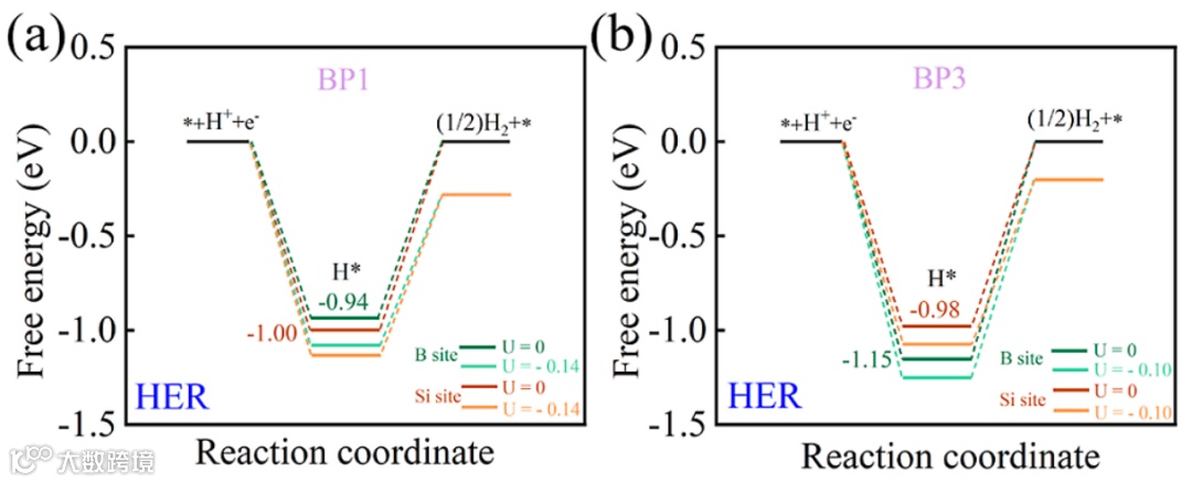 图 7. (a) B–Si@BP1 和 (b) B–Si@BP3 上HER 的自由能图。