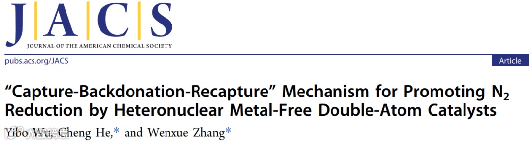 氨是农业、化学工业、纺织工业的重要原料之一,年产值超过1.5亿吨。然而,目前生产氨的主要方法:Haber-Bosch工艺,需要消耗大量能源(约占全球能源的2%),同时释放大量二氧化碳。因此,以环保的方式生产氨是当前需要解决的主要问题之一。电催化氮还原反应 (NRR) 作为一种更温和、成本更低的Haber-Bosch 工艺替代方案,引起了科学家们的兴趣。然而,由于纯金属催化剂的比表面积和孔隙率低,电催化固氮产率低,难以实现大规模工业应用。由于过渡金属原子的空和半满 d 轨道可用于容纳氮的孤对电子和反馈电子到 N2 的反键轨道,一系列过渡金属单原子催化剂被用于 NRR。此外,单原子催化剂对析氢反应(HER)的抑制能力优于传统的块体金属催化剂。然而,NRR 的产率和法拉第效率仍难以同时提高,主要是因为 NRR 涉及多个质子化过程和许多中间体。为了解决这些问题,研究人员已经提出了用于固氮的同核金属双原子催化剂。不幸的是,同核金属双原子催化剂对催化性能的提高相对有限。在天然固氮酶结构(包括FeMo蛋白)的指导下,异核金属双原子催化剂已被发现能够调节NRR的中间态,从而提高催化活性。然而,金属催化剂的d轨道电子有利于金属-H键的形成,从而降低了法拉第效率。此外,在催化过程中可能会有金属原子流失,从而导致环境问题。