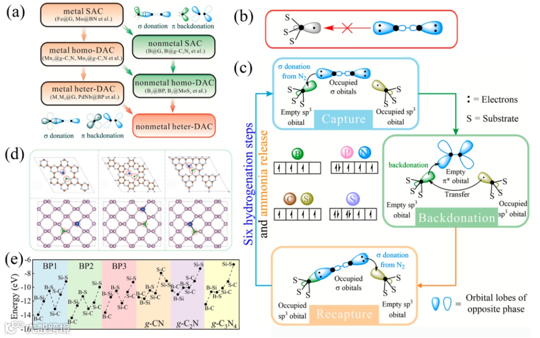 图1. (a) NRR催化剂的发展趋势。(b) 硼除外的非金属元素不利于氮捕获的示意图。(c) 新型“捕获-回馈-再捕获”机理的示意图。(d) 不同的底物和潜在的双催化中心位点。(e) 掺杂在衬底上的不同元素的结合能。