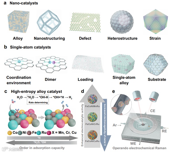 图1. 所设计的纳米催化剂、单原子催化剂和高熵合金催化剂的概念说明