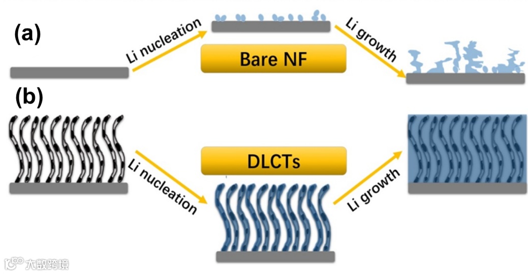 图2. 锂在(a)NF 和(b)DLCTs上的沉积行为示意图