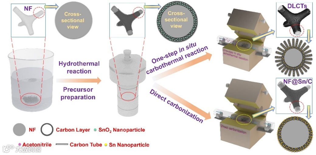 图1. DLCTs和NF@Sn/C的制备示意图。在清洗和水热反应后,将获得的NF基前驱体置于管式炉中,并在高温下进行一步原位碳热反应