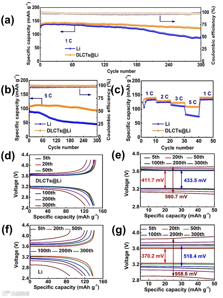 图3. 由 LiFePO4与 DLCTs@Li 或锂电极组成的全电池在(a)1 C,(b)5 C 和(c)不同的速率下的电化学循环性能图。(d)DLCTs@Li|LFP 和(f)Li|LFP 全电池在不同循环圈数的充放电曲线图。(e) DLCTs@Li|LFP 和(g)Li|LFP 电池在 1 C 下在不同循环阶段的放大的电压-比容量曲线