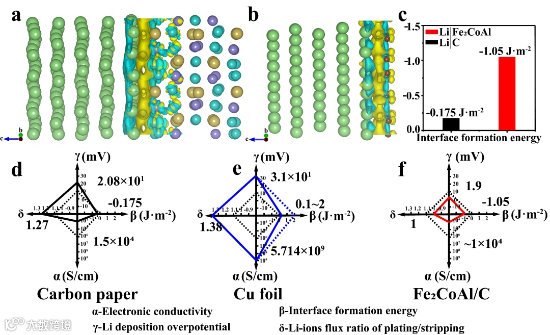 图4. (a) Li|Fe2CoAl/C 和 (b) Li|C 模型的差分电荷密度分布和界面形成能。蓝色(黄色)代表电荷的积累(耗尽)。(c) 相应的界面形成能直方图。(d) 铜箔、(e) 碳纸和 (f) Fe2CoAl/C 主体的坐标图与电子电导率、界面形成能、过电位和锂离子通量比的协同调制图的因素。