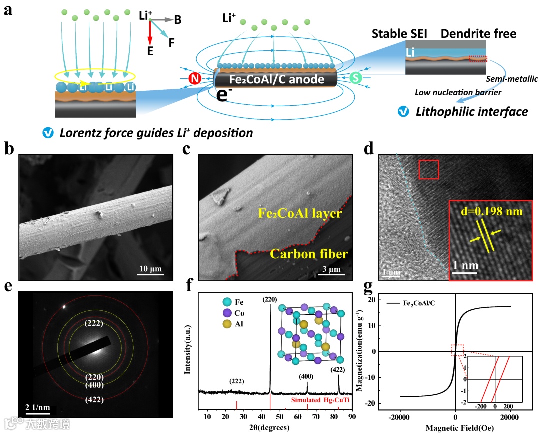 图 1. (a) 在洛伦兹力、半金属性和亲锂表面的协同作用下,锂离子在 Fe2CoAl/C 主体上的均匀沉积示意图;(b, c) Fe2CoAl/C主体的SEM图像、(d) HRTEM图像、(e) SEAD图案、(f) XRD图案和(g) 磁滞回线。