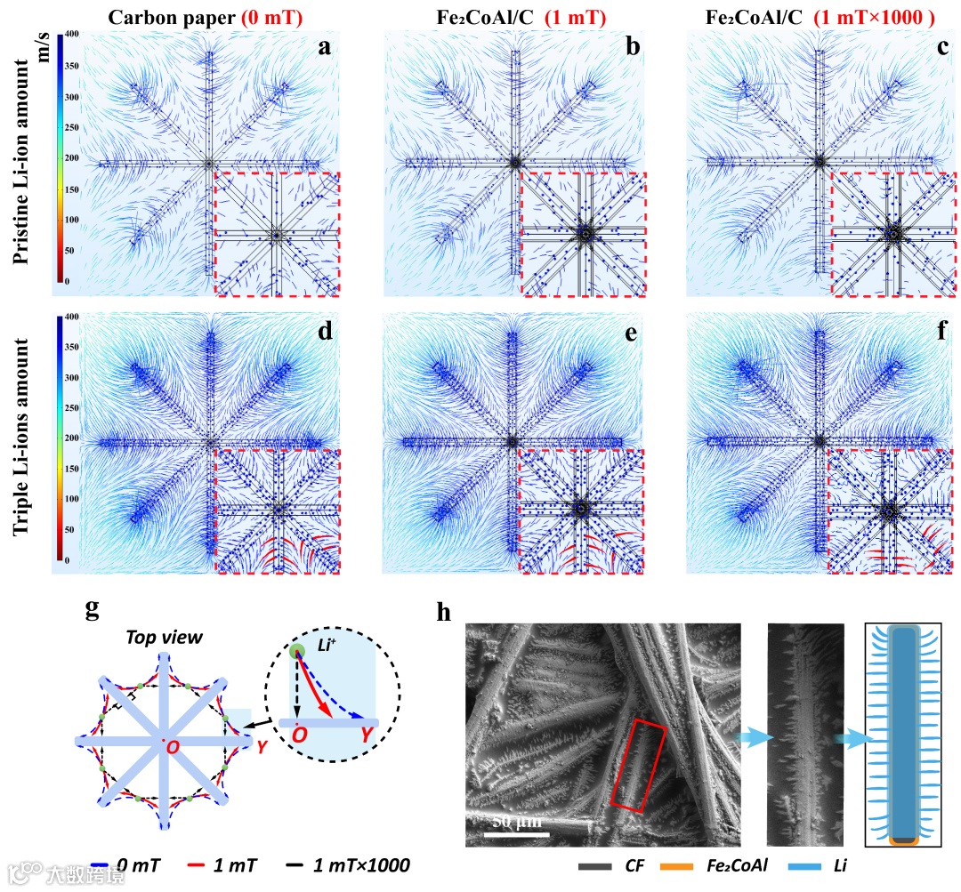 图 3. COMSOL 多物理场软件用于模拟锂离子在不同磁场强度和通量下的沉积轨迹。(a, d) 复写纸、(b, e) Fe2CoAl/C主体 (1 mT) 和 (c, f) Fe2CoAl/C主体 (1 mT×1000)在不同锂离子通量下的模拟;左边的刻度代表速度轴;(g) 对应的离子沉积轨迹俯视示意图;(h) 锂离子沉积痕迹的SEM图像和循环后的相应示意图。