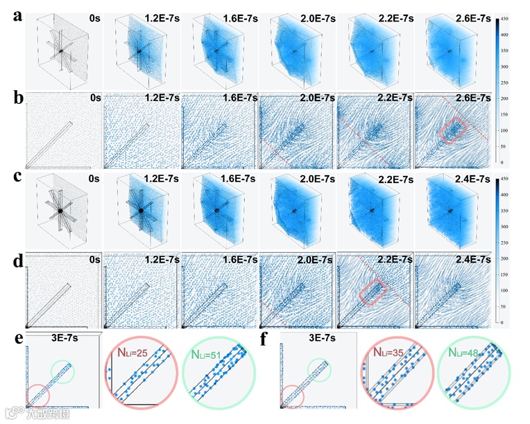 图 2. (a, b) 碳纸主体和 (c, d) Fe2CoAl/C上锂离子动态传输过程的COMSOL多物理场模拟;(e) 碳纸主体和 (f) Fe2CoAl/C上最终的锂离子扩散情况和相应的放大部分。