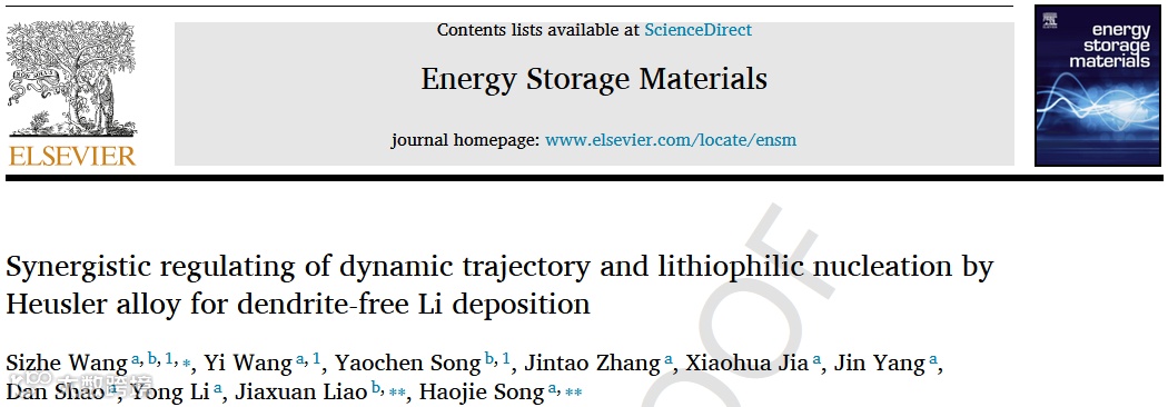 Sizhe Wang*, Yi Wang, Yaochen Song, Jintao Zhang, Xiaohua Jia, Jin Yang, Dan Shao, Yong Li, Jiaxuan Liao* and Haojie Song*. Synergistic Regulating of Dynamic Trajectory and Lithiophilic Nucleation by Heusler Alloy for Dendrite-Free Li Deposition. Energy Storage Materials 50,(2022):505-513.
