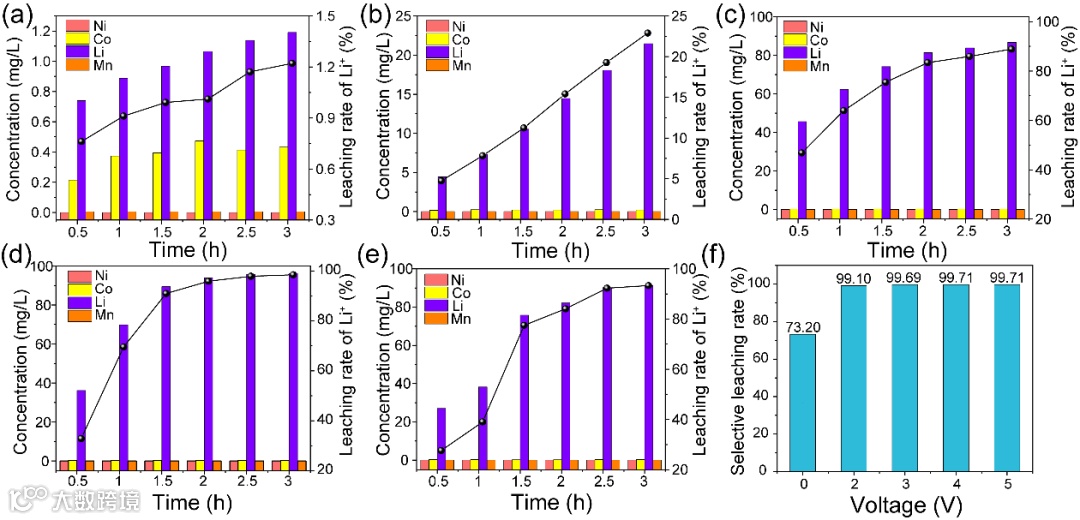 图2. 电压和时间对不同金属浸出率和浓度的影响:(a) 0 V; (b) 2 V; (c) 3 V; (d) 4 V; (e) 5 V, (f) Li+在不同电压下的选择性浸出率