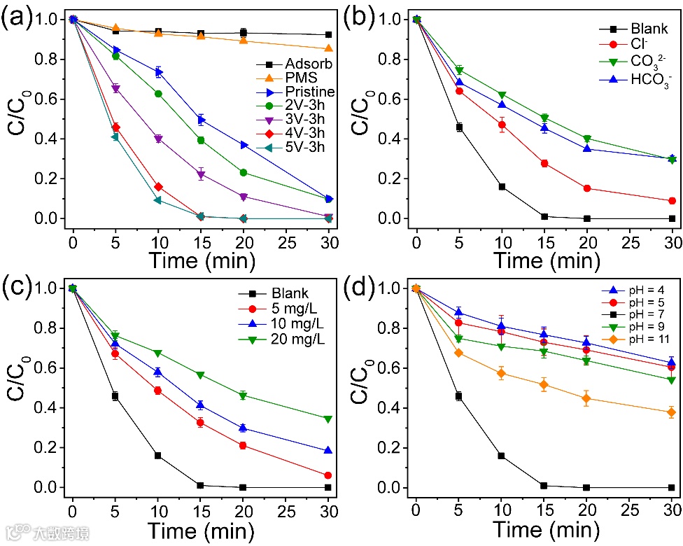 图4. (a)不同催化剂对SMX的降解效果;(b)不同阴离子、(c)腐植酸(HA)和(d)pH对4V-3h/PMS体系中SMX降解的影响。