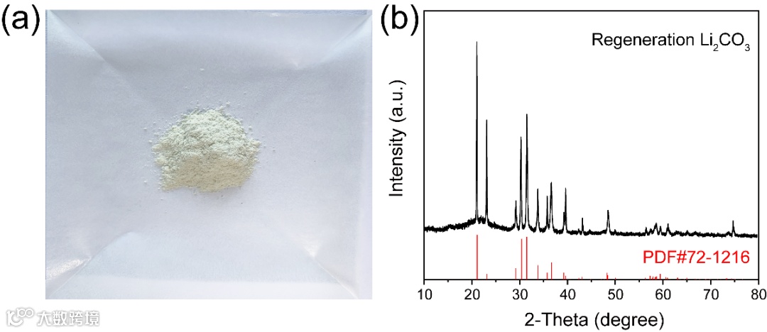 图3. (a)再生Li2CO3的实物图片;(b)再生Li2CO3的XRD图谱