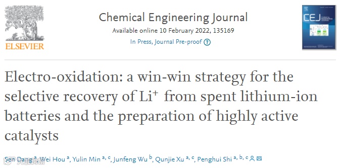 时鹏辉,CEJ研究文章:电氧化 - 一种从废旧锂离子电池中选择性回收Li+和制备高活性催化剂的双赢策略 科学材料站
