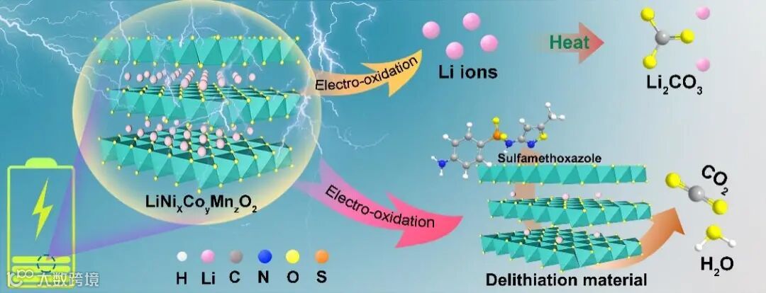 导读:该研究通过一种双功能的电氧化技术,成功实现废旧三元电池中锂的选择性浸出和脱锂材料的原位改性。浸出的锂可以被转化为Li2CO3,而脱锂材料则展现出更优异的活化PMS能力,能够更高效的降解磺胺甲恶唑。