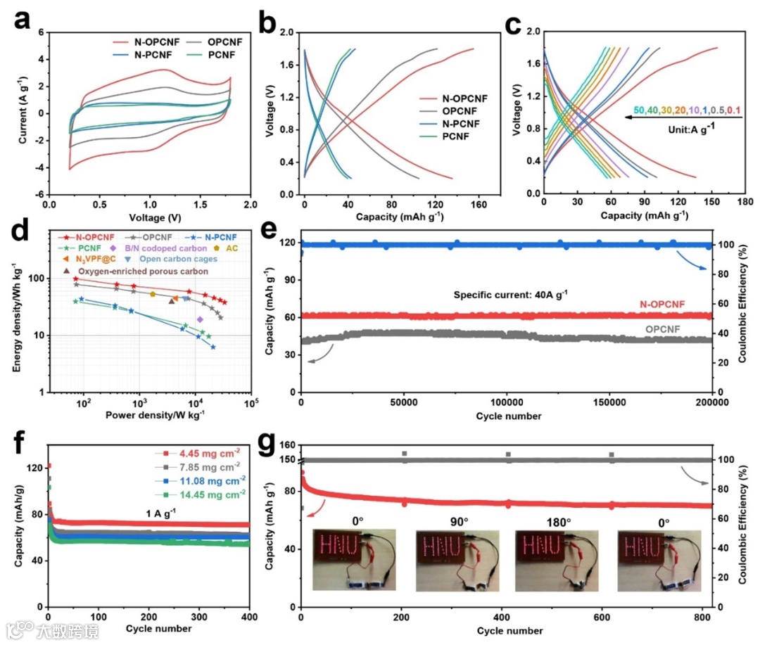 图2. (a) N-OPCNF及其对比材料的CV曲线;(b) N-OPCNF及其对比材料的充放电曲线;(c) N-OPCNF的倍率性能;(d) N-OPCNF的能量/功率密度关系图;(e) 40 A g-1的电流密度下N-OPCNF和OPCNF的长循环性能;(f) N-OPCNF在不同负载量下的循环性能;(g) N-OPCNF软包电池在不同弯折角下的循环性能